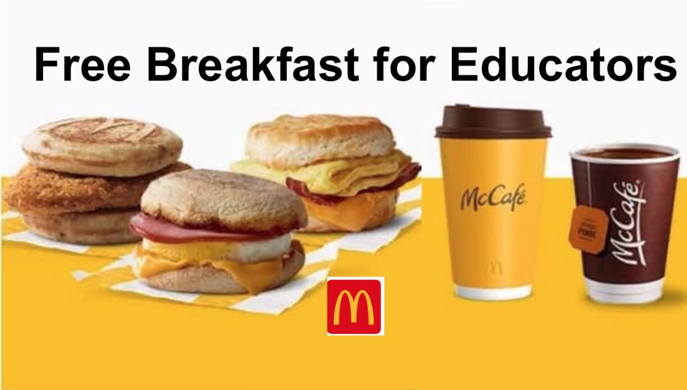 McDonald's Is Offering Free Breakfast Meals to Teachers, School Staff , Teachers, administrators or school staff can simply head to any participating mcdonaldâs during breakfast hours from oct. On tuesday, may 7, mcdonaldâs will serve teachers a free egg mcmuffin and medium mccafĂ© hot or iced coffee or a medium soft drink.